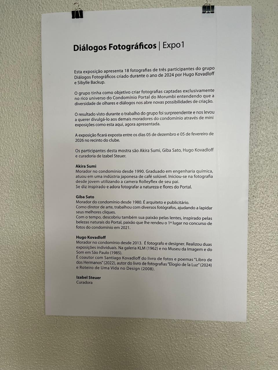 Os créditos da exposição ficam para Izabel Voegeli Steuer e os fotógrafos Hugo Kovadloff, Akira Sumi e Gilberto Sato.